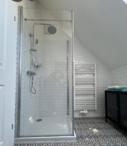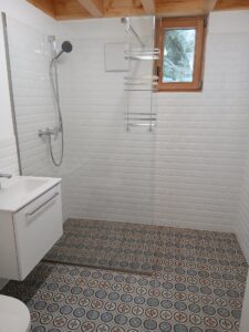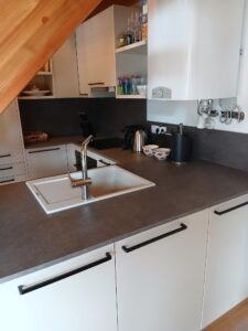 Die voll ausgestattete Küche ermöglicht flexible Selbstversorgung – ideal für längere Aufenthalte. Das moderne Badezimmer bietet stilvollen Komfort und lädt nach einem Ausflug in die Region zum Entspannen ein.