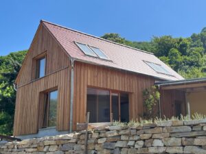 Die voll ausgestattete Küche ermöglicht Frühstück oder Abendessen mit regionalen Köstlichkeiten. Das moderne Badezimmer lädt zum Abschalten ein. Große Fenster holen die umliegende Landschaft ins Haus.